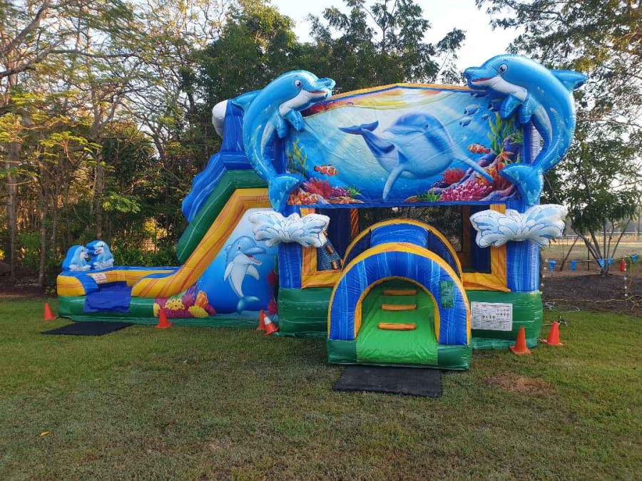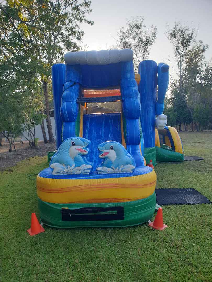 Climb n slide. Water hose connects to the top of the slide. Mesh walls to let the breezes through, keeping the kids cool.
