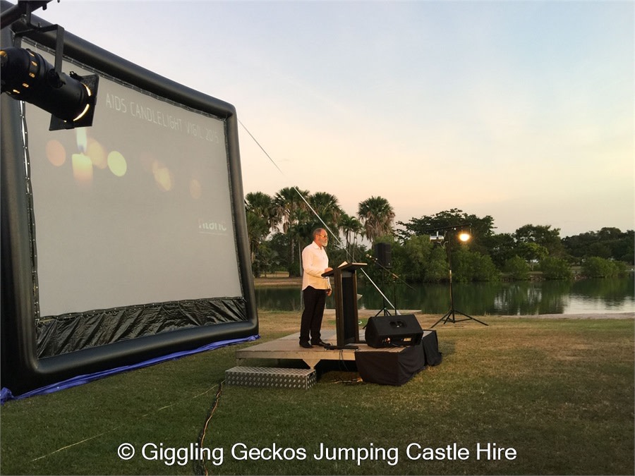 Giggling Geckos Pop Up Cinema Hire movie screens are of an unusual construction, with the main frame being made from heavy duty PVC and inflatable, much like a jumping castle. The screens themselves are cinema quality projection surfaces, also made from PVC.