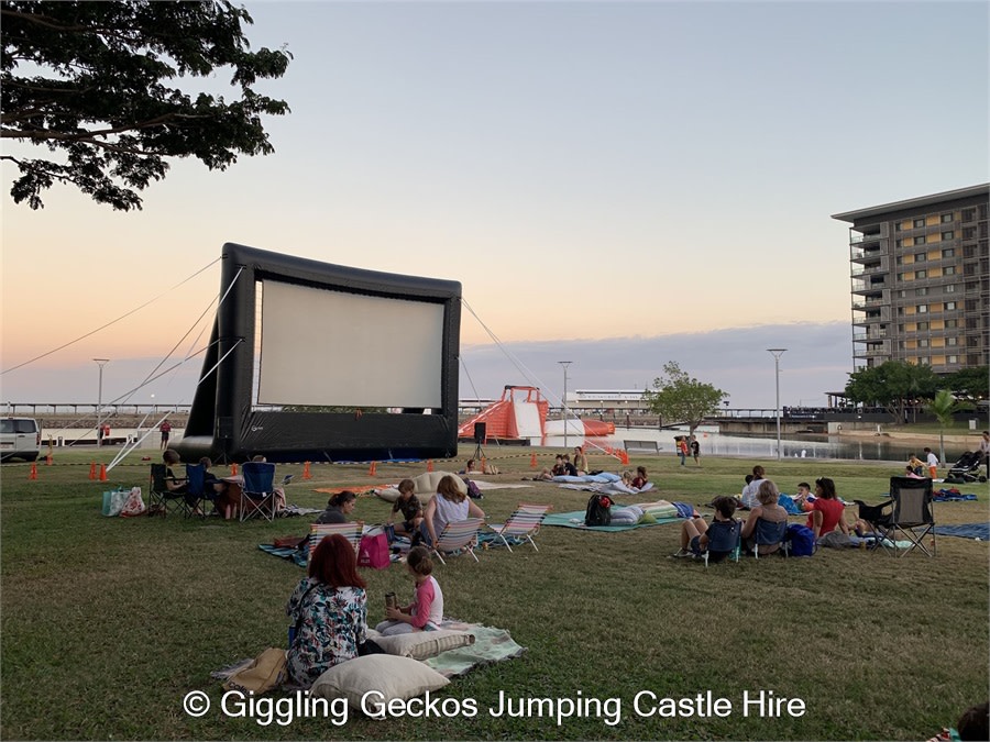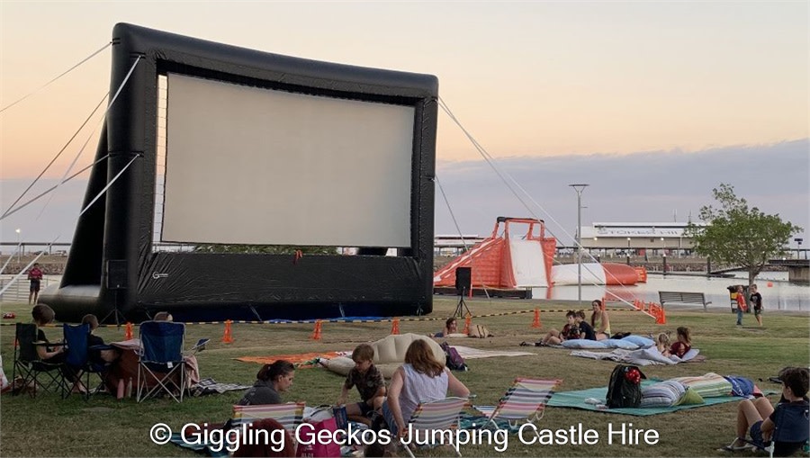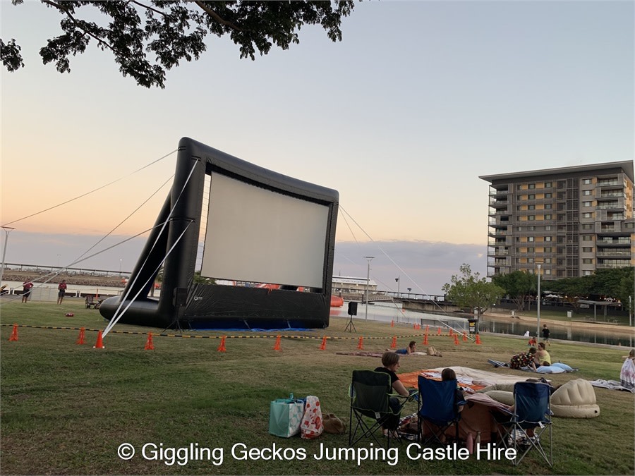 Giggling Geckos Pop Up Cinema Hire movie screens are of an unusual construction, with the main frame being made from heavy duty PVC and inflatable, much like a jumping castle. The screens themselves are cinema quality projection surfaces, also made from PVC.
