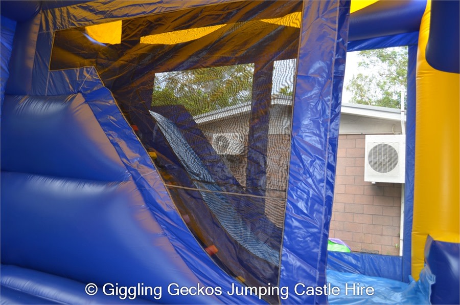 Climb n slide. Water hose connects to the top of the slide. Mesh walls to let the breezes through, keeping the kids cool.